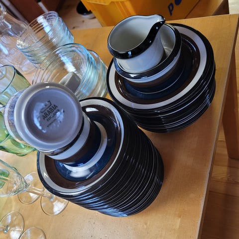 15 kpl Arabian Karelia kuppeja 1.5dl tasseineen ja 19 kpl lautasia, koko 17 cm.
