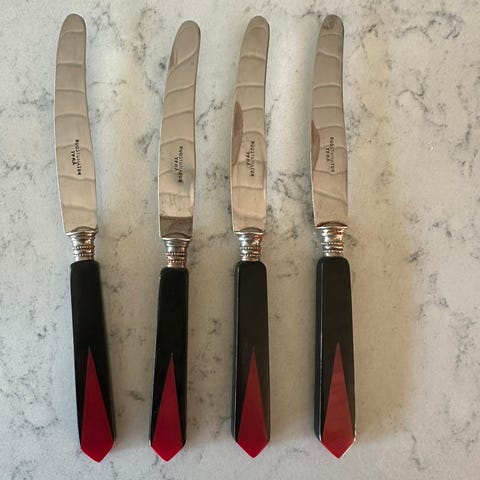 Kauniit pienet veitset, alkupala tarkoitukseen tai tarjoiluun. Suomalainen design. Valmistajasta ei varmaa tietoa. Suomeksi lukee ruostumaton terä. Mitta pituus 17cm.