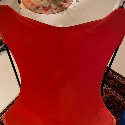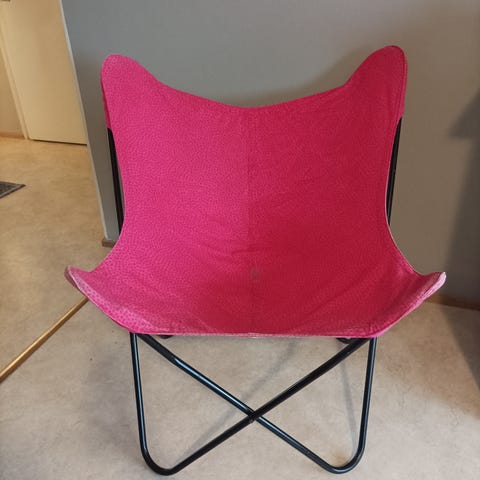Hyväkuntoinen Varaxin Lepakkotuoli, kangas ommeltu itse. Lisänä erillinen irroitettava tasku esimerkiksi kaukosäätimelle. Vain nouto. Maksu käteinen tai mobilepay.