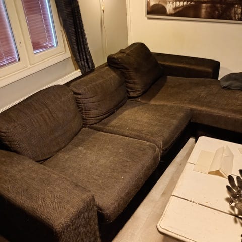Tästä hakemisen vaivalla sohva vaikka mökille tai harrastetilaan. 300 x 240 kulmasohva. Elämää nähnyt, eläinperheessä ollut. Muutamassa selkätyynyssä vetoketju rikki ja ommeltu kiinni. Muuten vielä ryhdissään mutta toki kulunut jo. Kätisyyttä ei pysty vaihtamaan.