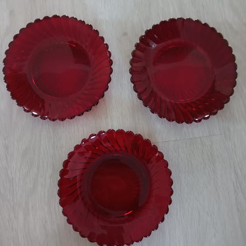 Riihimäen lasin punaiset Baccara / Baccarat / Kierre sarjan lautaset. Halkaisija vajaa 14 cm. Yhteensä 6 kpl. Hinta kaikille yhteensä. Postitus onnistuu Toridiilinä tai tavallisena pakettina 8,90