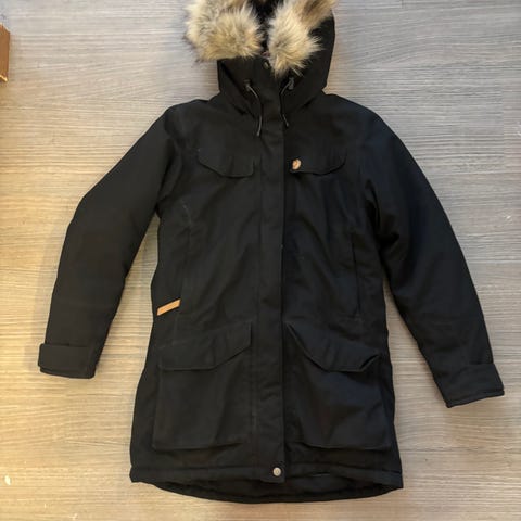 Fjällrävenin musta Snow Flake parka kevytuntuvatakki kokoa xs. Huippuluokan kevytuntuvatakki, pituudeltaan parka n. 85cm olka-helma. Naisten malli, vyötärö kaventuu kivasti. Sivuilla vetoketjutaskut ja vasemmalla povitasku vetoketjulla. Kainalo-kainalo n. 45cm, vyötärö kapeimmalla kohtaa n. 41 cm. Moitteettomassa kunnossa, ei ole pesty, ei tarvetta ja untuvat tasaisesti. Tsekkaa mitat jos käytät Fjällrävenin xs-s tavallisesti, mitoitus mielestäni sama kuin Kiiruna padded parka, xs napakahko tavanomaiseen Fjellun xs-takkiin. Tarkemmat tiedot takista löytyy mm. Fjällrävenin ja Partioaitan sivuilta, OVH 550-580 eur.