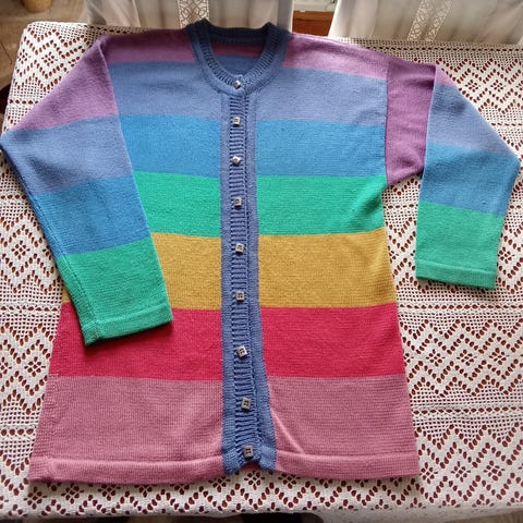 Kunto erittäin hyvä, neule jäi vähälle käytölle. Takissa on olkatoppaukset.