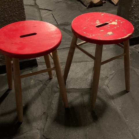 Jakkarassa on selviä kulumisen merkkejä. Maalipinta jaloissa on kulunut ja kankaassa on näkyvää kulumaa. Tämä antaa jakkaralle autenttisen vintage-ilmeen.