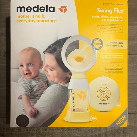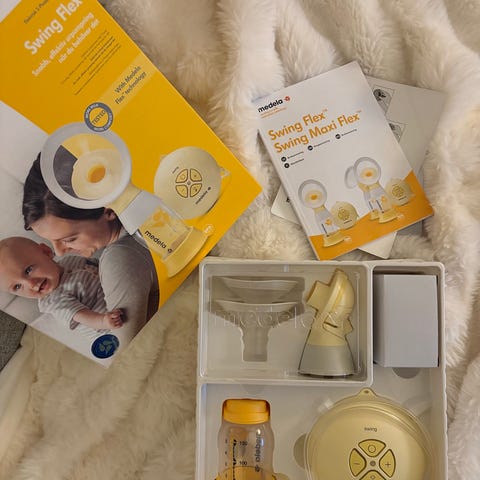 Medela Swing Maxi Flex rintapumppu, johon 21 ja 24mm rintasuuttimien lisäksi mukaan erikseen tilatut 30mm.