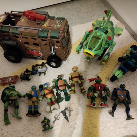 Suurimmaksi osaksi turtlesia yksi hämis lelu löytyy joukosta , joitain osia puuttuu kulkuneuvoista (voi vielä jotain löytyä ) yhdeltä figuurlta irtoaa pää mutta pysyy paikallaan , mutta suurimmaksi osaksi leikittävissä kunnossa lelut.