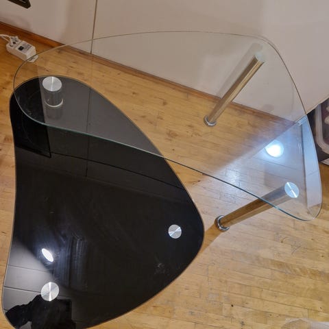 Lasikannella oleva sohvapöytä tarpeettomana. Yksi isompi naarmu lasissa ja käytön jälkiä.