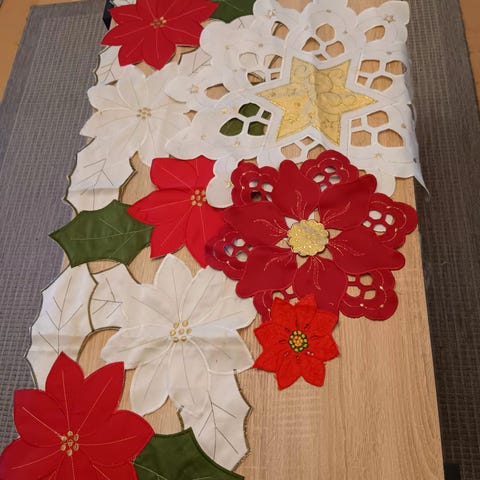 - Beigepunainen pöytäliina pesun jäljiltä. Ei käytetty.
