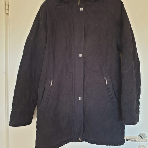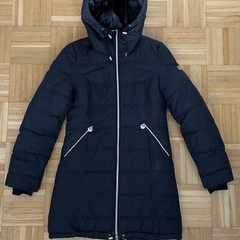 Myydään siistikuntoinen Röhnischin musta toppatakki koossa 34. Vetoketjutaskut, säädettävä huppu ja vetoketjut myös takin sivuilla, joilla helmaa voi avata hieman