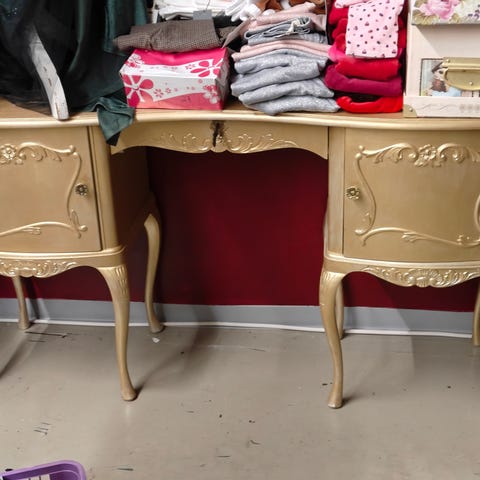 Myydään puolipyöreä barokkikonsolipöytä kullanvärisellä peilillä. Marmoritasot ovat beigen väriset.