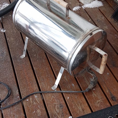 Ruostumattomasta teräksestä valmistettu sähkösavustin. Ihan toimiva peli mutta aika rujon näköinen, vaikka mökille varasavustimeksi tai reissuun mukaan. Pohjasta paistaa kevyesti valo läpi, kansi hieman jumittaa kun pönttö ei taida olla enää 100% pyöreä jne. Tähän päivään asti ollaan kuitenkin savustettu lohet ilman ongelmia ja maukkaita on olleet.