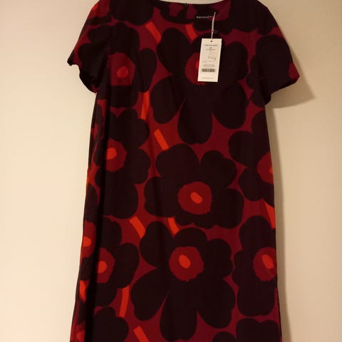Marimekon ihana Lilian mekko koossa 34. Upeat vaaleanpunainen ja lila yhdistelmä piparkakkumuodolla takaavat näyttävän asun juhlaan kuin juhlaan. Kangas ryhdikästä puuvillaa, sisällä ohut lila vuori, hihat ilman vuorta. Takana piilovetoketju ja sivuilla taskut. Olkapään napeista saa myös avattua.