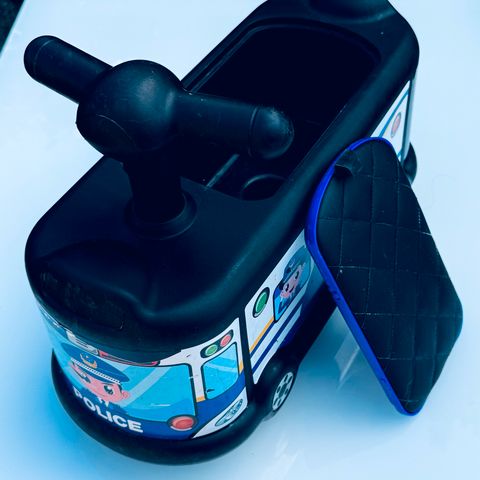 Lasten sininen poliisirekka, muovia. Hyvässä kunnossa, mutta joistain kohdista tarrat vähän kuluneet tai irrallaan. Tämä näkyy kuvissa.