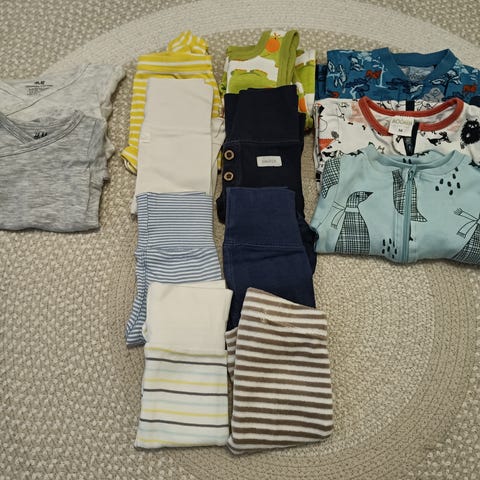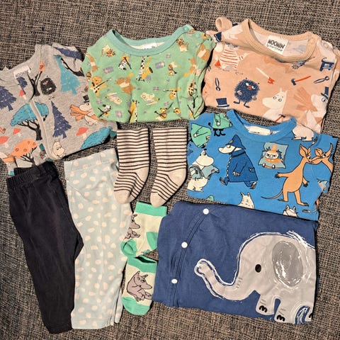 Mustat housut, auto body, muumi body(tum.sin) ja tähti body ovat koossa 68cm.