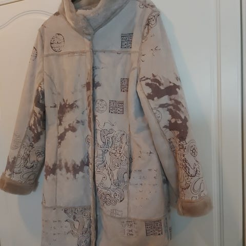 Laadukas, tekoturkis huppu, mokkajäljitelmää ja tikattu nailon selkäosa, vetoketju ja taskut, 165 cm polveen saakka. Mukaan ruskea sininen huivi , vähän käytetty. Yht hinta 45€