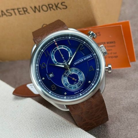 Upea herrannäköinen kello Master Worksilta. Referenssinumero MW17SOEDLBO0. Kello toimii kvartsiliikkeellä. Varustettu päivämääränäyttöön klo 9 kohdalla. Lisäksi siinä on kronografi ja näyttävä kotelo.