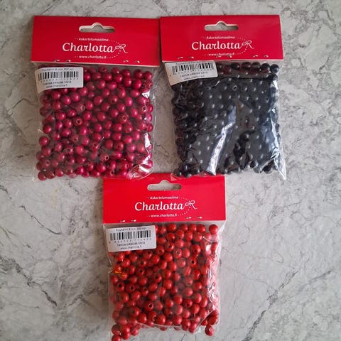 Myydään Preciosan värillisiä puuhelmiä neljässä eri värissä: sininen, harmaa, punainen ja vihreä