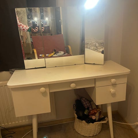Kokonaisuudessaan näppärän kokoinen, kevyt ja siisti työ/meikkipöydäksi.