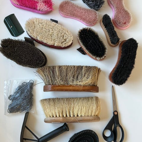 Kaksi harjaboksia, sekä kuvan mukaiset harjat. Lisäksi kaviokoukku ja letityskuminauhoja iso pussi. Viisi harjoista on ulkomailta tilattua laatutavaraa, joiden hinta oli jopa 25€/kpl sillä ne ovat hienokarvaisellekin hevoselle ihanan pehmeää luonnonkarvaa. En nyt muista minkä eläimen, mutta lopputulos viimeistellyn silkkinen esim kisoihin valmistellessa. Kaikki jääneet vähäiselle käytölle, sillä toinen hevosemme jouduttiin lopettamaan vain muutaman kuukauden omistuksen jälkeen ja toinen lähti sitten uuteen kotiin.