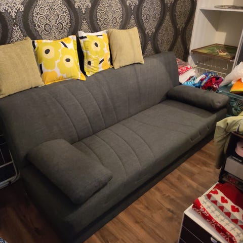 Hyväkuntoinen divaanivuodesohva, leveys 230, divaaniosa 150, nukkumaleveys 140, istumakorkeus 45, istuinsyvyys 60. Vuodevaatelaatikko. Väri on meleerattu musta. Kuvassa oleva sijauspatja ei kuulu kauppaan. Hinta 150€. Pikkukoiratalous.