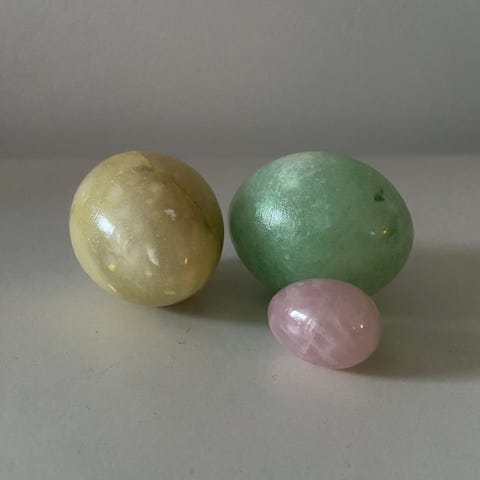 Kivat keramiikkamunat x2, korkeus 5,5 cm. Hyvä kunto, vihreän maalipinnassa vähän patinaa (kuva). Yhteishinta. Nouto tai postitus.