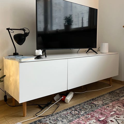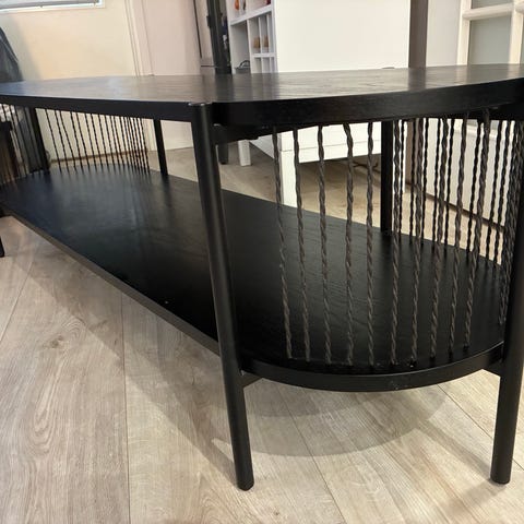 Vaalean tammen värinen sneslev hylly/TV-taso. Oikein hyvässä ja siistissä kunnossa, jotain pientä käytön jälkeä, muttei mitään huomattavaa.