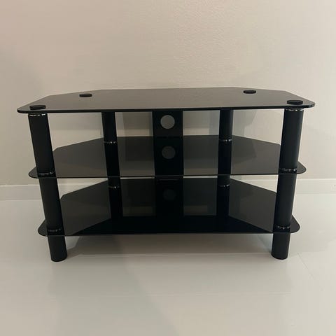 Valkoinen TV-taso hyllyllä. Nouto Kalasatama Helsinki.