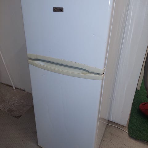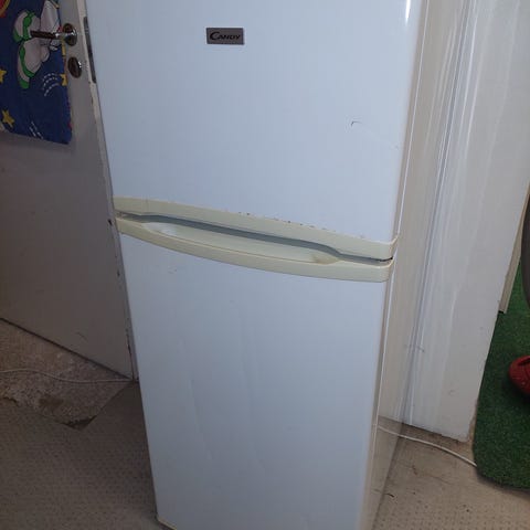 Candy jääkaappi, jossa on pakastinosa yläosassa. Väri valkoinen.