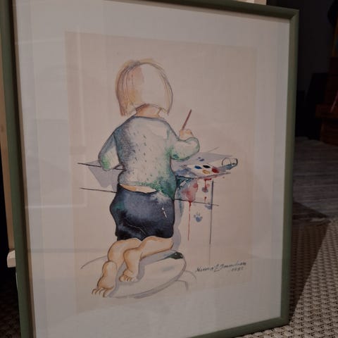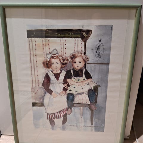 52cmx42cm. Minna Immosen kaunis julistetaulu vaihtokehyksessä sekä siihen sopivissa vihreissä puukehyksissä. Ostettaessa ollut jo pienet laineet julisteessa, reunoilla näkyy, ei seinällä tietyssä valossa niinkään.
