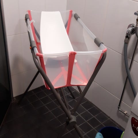 Pieneen säilytystilaan menevä amme kylvetystuella. Ammeessa on luistamaton pohja ja tyhjennystä helpottava muovitulppa pohjassa. Kylpytuki, helpottaa vastasyntyneen kylvettämistä. Sivuille merkityt aaltokuvioinnit auttavat täyttämään veden määrän sopivaksi kylpytukea käytettäessä. Molemmat erittäin siistissä kunnossa. Altaan reunasta irronnut pidike, joka pitää altaan taiteltuna litteänä. Ei käytännön merkitystä.
