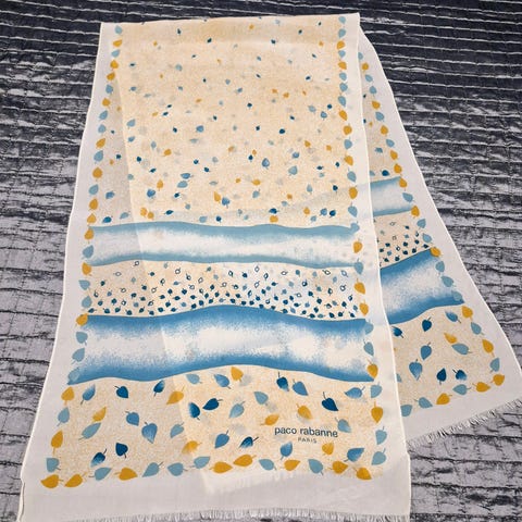 Myydään erittäin hyvässä kunnossa oleva Loewe-merkkinen vintage silkkihuivi. Väriltään valkoinen sinisillä yksityiskohdilla. Koko 87cm x 87cm.