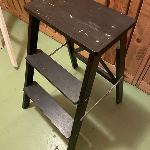 Uutta vastaava, lähinnä koristeena ollut Askon porrasjakkara. Ala-askelman saa taitettua piiloon, jolloin mahtuu pieneenkin tilaan. Materiaalina massiivitammi.
