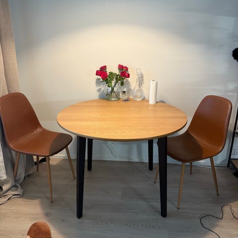 Jyskin Jegind-ruokapöytä. Valkoinen pöytälevy ja puiset jalat.