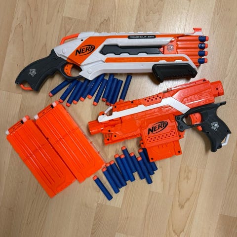Nerf lasten leluaseet. Sisältää 2kpl automaattitoimisia leluaseita. Lisäksi runsas määrä lisäpanoksia