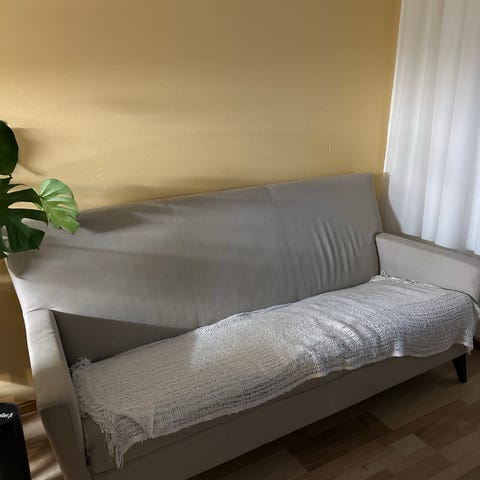 Muuton tieltä pois mukava sohva. Muutoin täysin ehjä ja pehmusteet hyvässä kunnossa, mutta sohvan kulmauksissa pientä kosmeettista haittaa kissan kynsien seurauksena.
