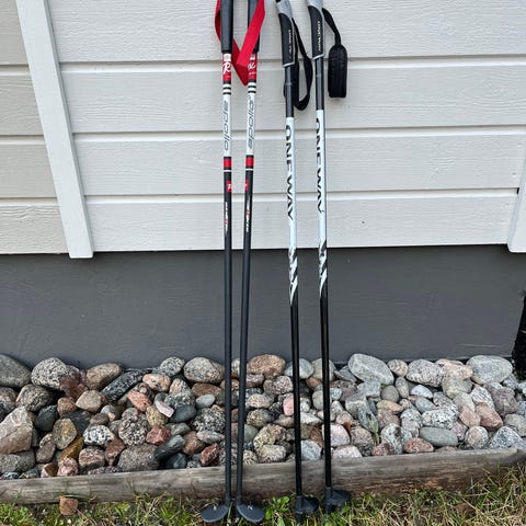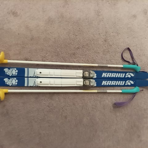 Kenkiin kiinnitettävät sukset 100cm ja sauvat 80cm. Parhaat n.100-105cm pituiselle hiihtäjälle.