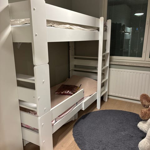 Unipuun kerrossänky, ostettu vuonna 2018. Käytetty kerrossänkynä pari vuotta, minkä jälkeen sängyt otettu erilleen ja käytetty yhden hengen sänkynä.
