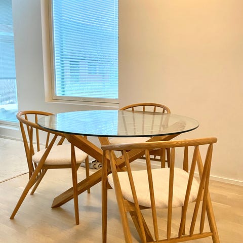 Tukeva ruokapöytä tulppaanijalalla. Ympärille mahtuu jopa 6 tuolia, mutta meillä ollut käytössä vain 4 ja toimii hyvin myös siten.