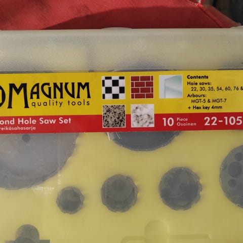 Huippulaadukas Magnum -timanttirasiaterä 105 mm halkaisijalla. 30 mm sahaussyvyys. Vain pari kertaa käytetty tiiliseinään jakorasialle ja sähkökiukaan johtorasialle. Sopii siis keraamisille materiaaleille kuten kuivapuriste- ja savipohjaisetlaatat, graniitti, posliini, lasi, tiilet jne. Sopii käytettäväksi samalla istukalla kuin muut reikäsahat.