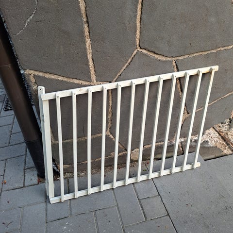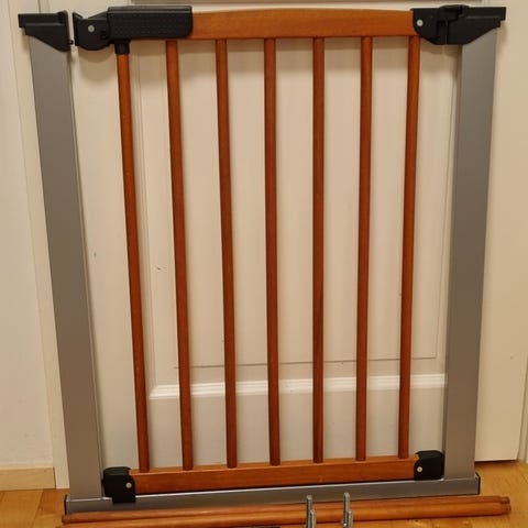 Puinen valkoinen lapsiportti portaikkoon tai oveen. Leveys 94cm, korkeus 70cm. Helppo kaventaa. Tarvittavat kiinnitysruuvit tulee mukana.