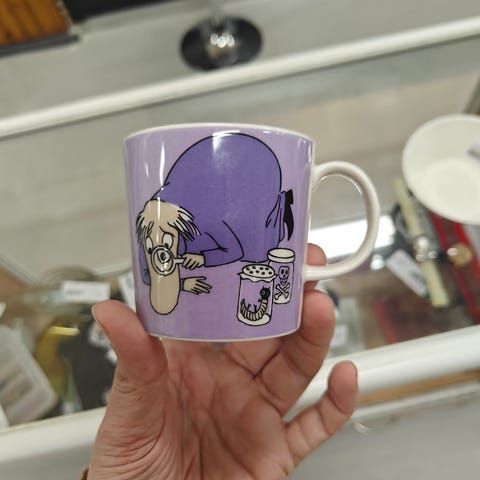Violetti Hemuli-muumimuki, ollut tuotannossa vuosina 2004–2013. Ollut vitriinisäilytyksessä, ei käytetty.