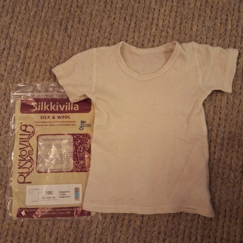 Myydään Ruskovillan silkkivillainen paita. Koko 140 cm, mutta paita on käynyt klassisen liian kuuman pesun edellisellä omistajalla ja vastaa nyt kokoa 134 cm. Nyppyä löytyy, mutta ei reikiä.