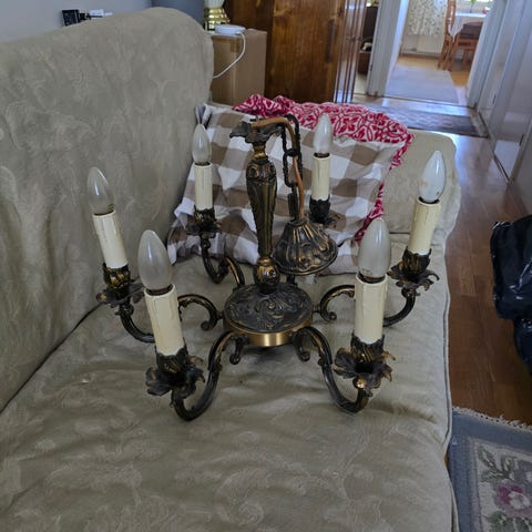 Viisihaarainen metallinen kattokruunu. Lamput eivät kuulu kauppaan. Laadukas ja hyvässä kunnossa. Ostettu aikanaan Stockmannilta.