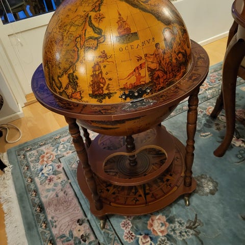 Myydään kuvan karttapallon mallinen tyylikäs baarikaappi. Kaapin sisällä tilaa pulloille sekä laseille. Myös alaosaan mahdollista säilöä pulloja. Kannen ulkopinnassa havaittavissa yksi pieni kupru, joka mahdollista korjata (kts. kuva).