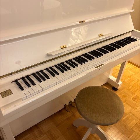 Samickin täyspuinen mahonkinen pianotuoli, jossa säilytyslokero.