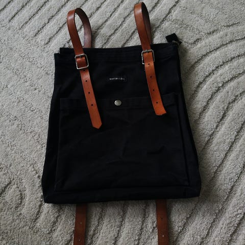 Musta reppu paksusta kankaasta. Repussa on kaksi osiota, joiden välissä on pieni tasku. Edessä on painonapilla suljettava tasku. Nahkaiset, säädettävät olkahihnat. Kangas on joistakin kohdista hieman vaalentunut, mutta reppu on muuten hyvässä kunnossa. Ostettu reilu vuosi sitten ja ollut vähäisessä käytössä. Reppua ei ole pesty