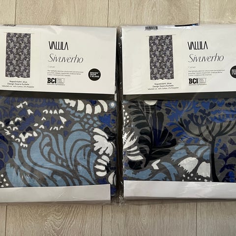 Myydään Vallilan koivikko verhot. Oikein hyväkuntoiset. Tankonauha. Lyhennetty siististi 230 cm:iin.