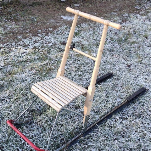 Kuura kokoontaitettavat potkukelkat liukujalaksilla. Aikuisten koko. Puuosat ulkona säilytyksen jäljiltä tummuneet, kuitenkin ehjät ja kovat. Näitä 2 kappaletta, 30 € / kappale.