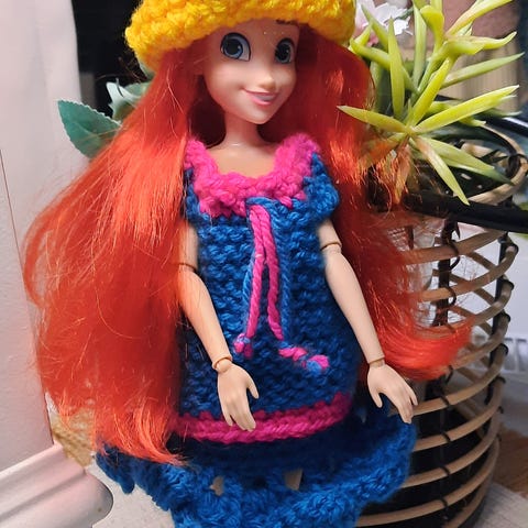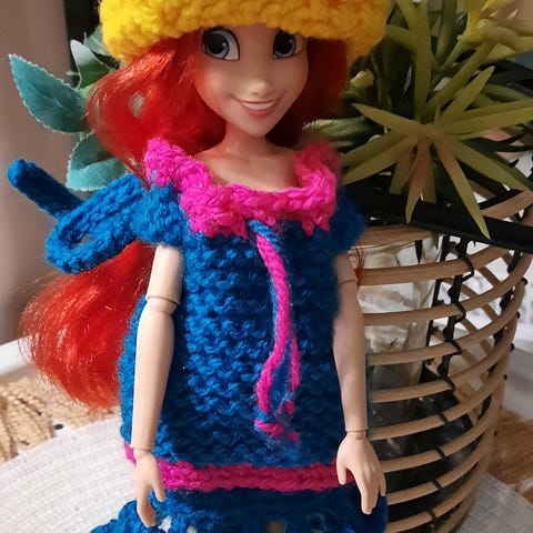 Hyväkuntoinen nukke uusilla itse neulomilla vaatteilla.