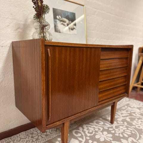 Kolmesta osasta koostuva upea vanha pitkä kotimainen vintage tiikki senkki 1960-luvulta.